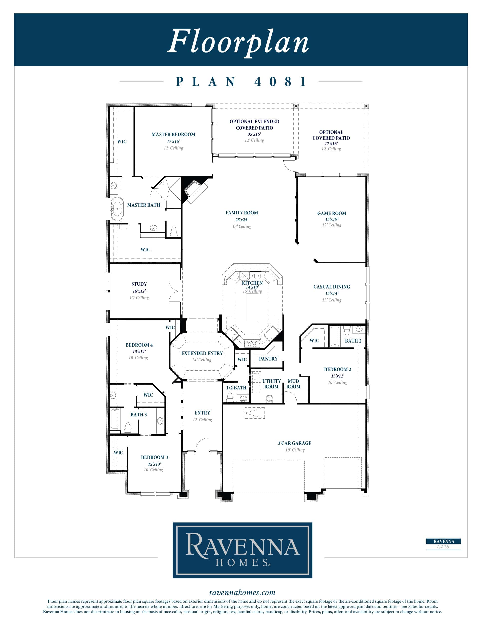 1-story floor plan features an extended entry with coffered ceilings. Open kitchen with 15’ ceiling is central to dining, breakfast, family, and game rooms and features 42" raised panel cabinets with built-in stainless steel microwave plus oven with separate 36” 5-burner gas cooktop, a large island with high bar that overlooks the huge 26'x20' family room with 14’ ceilings and full wall of windows. Master bath includes a freestanding tub, separate shower, His and Hers vanities, and two huge walk-in closets. 3-car garage.