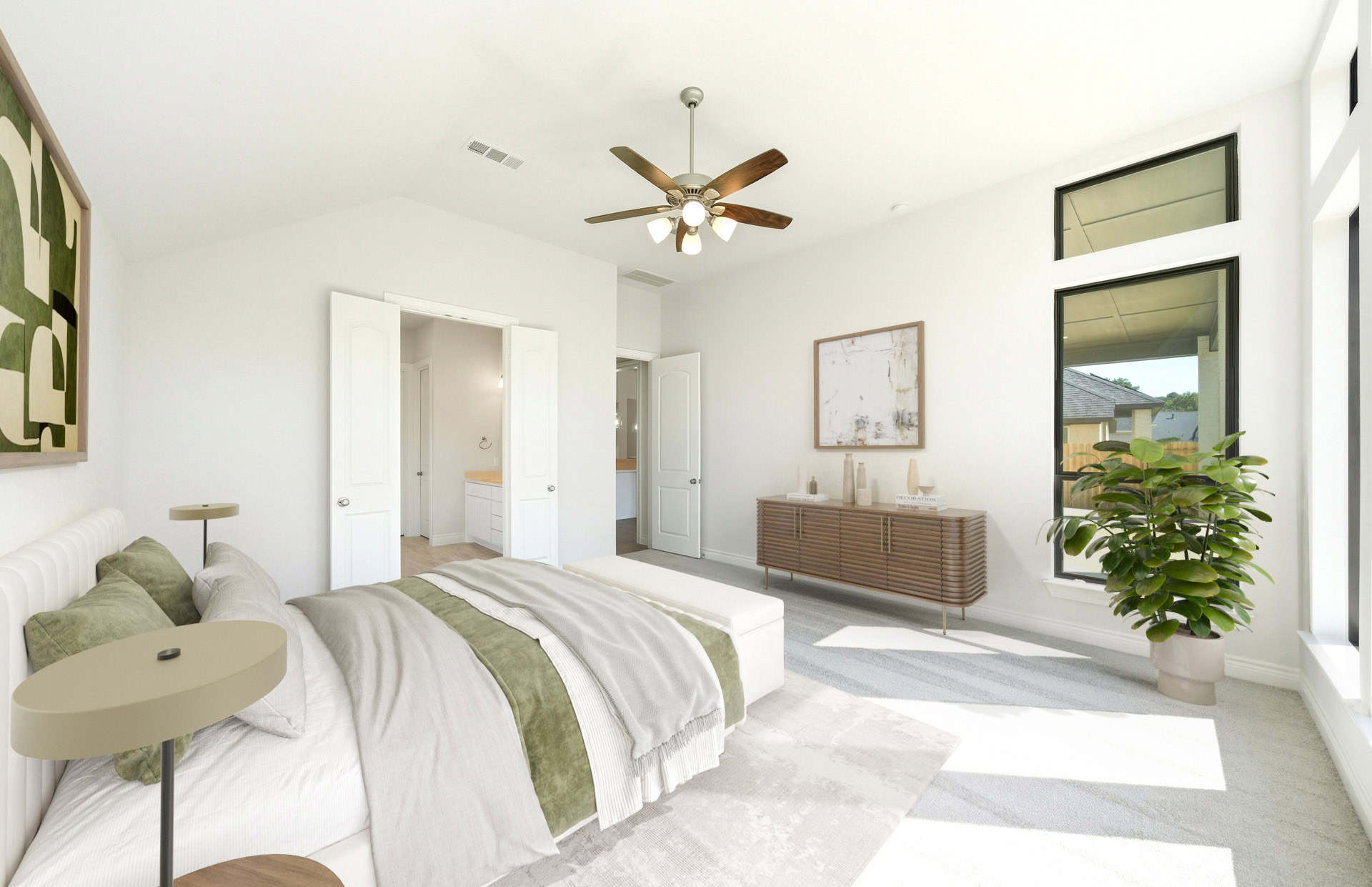 1-story home features large entry with 12' ceilings that extend past open dining room. Open kitchen overlooks the large family room, breakfast room, and features 42" cabinets, high-bar seating, and an oversized island. Family room features a corner electric fireplace and full wall of windows. Master bath includes a freestanding tub, separate shower and His and Hers vanities. Oversized 33' wide patio overlooks the backyard.