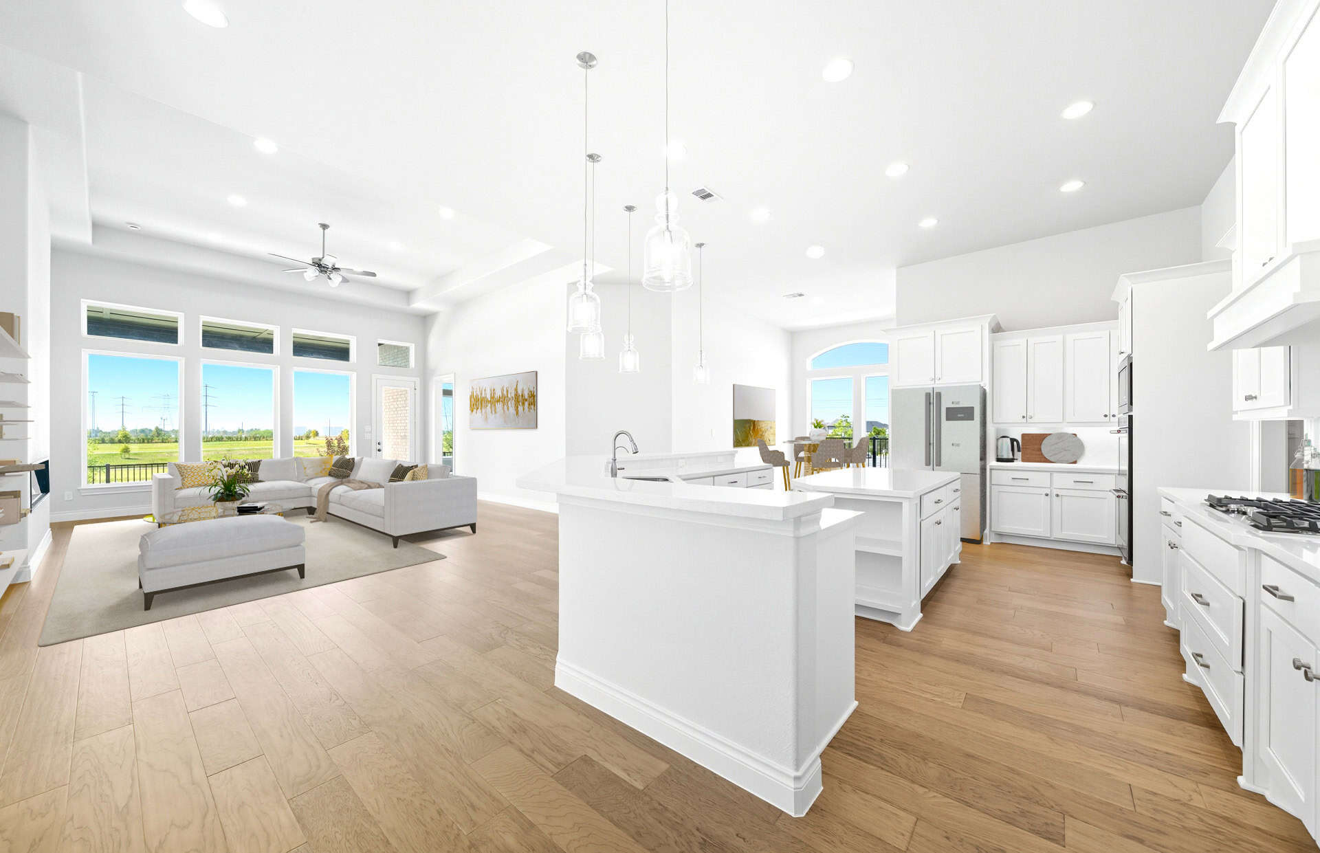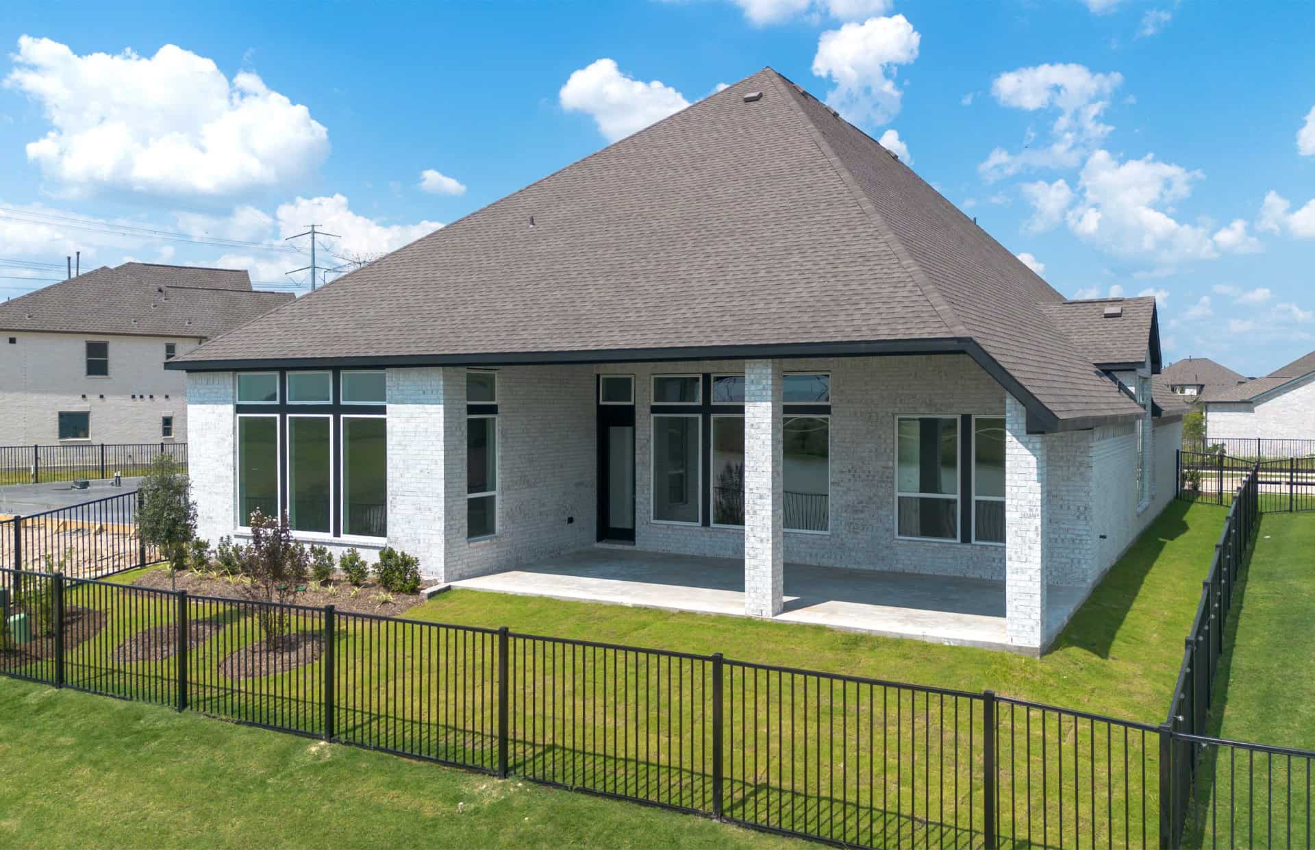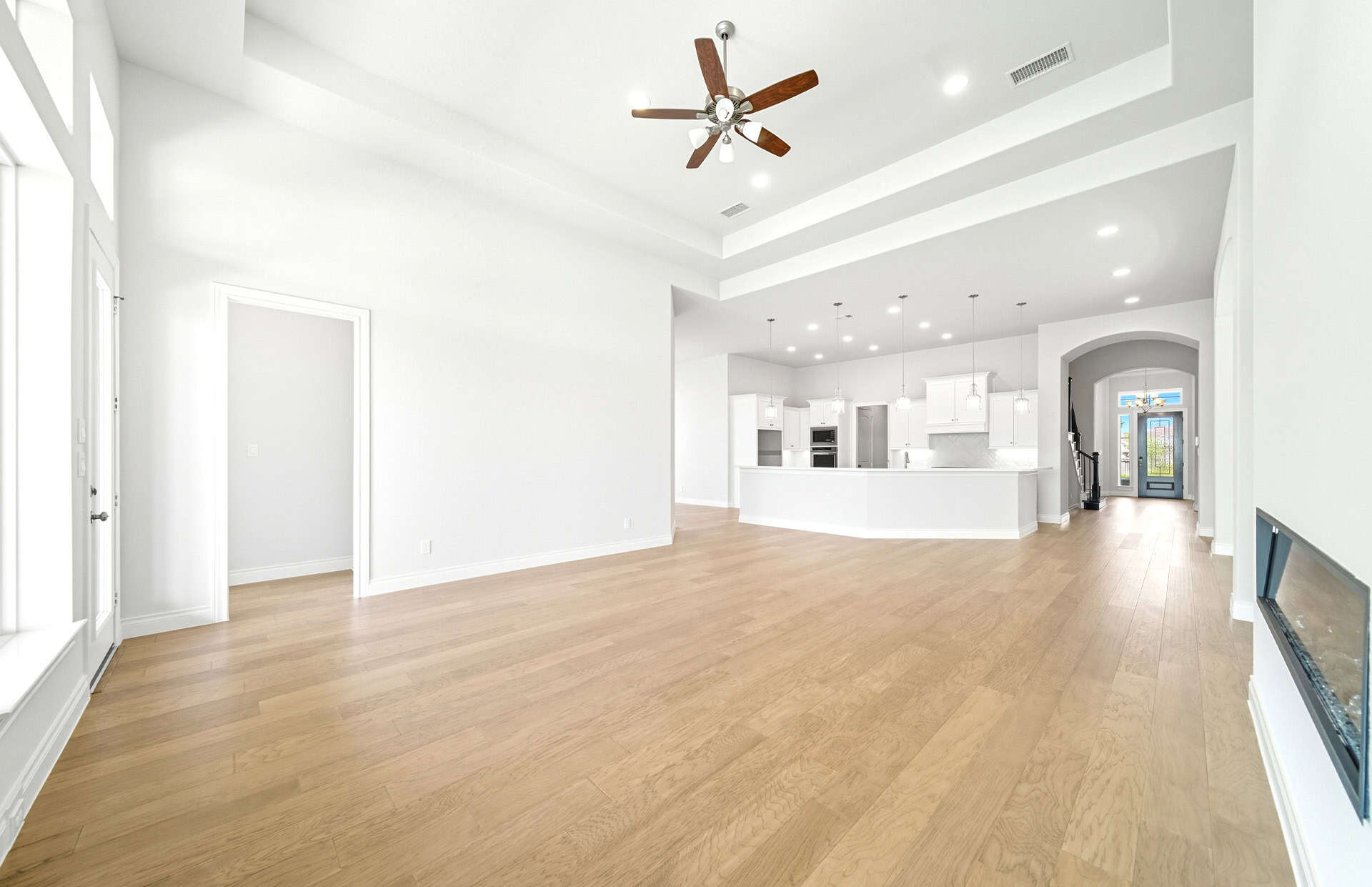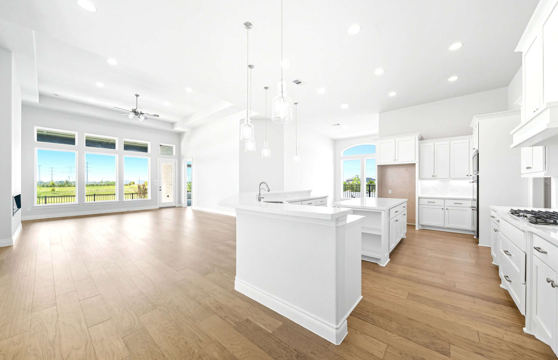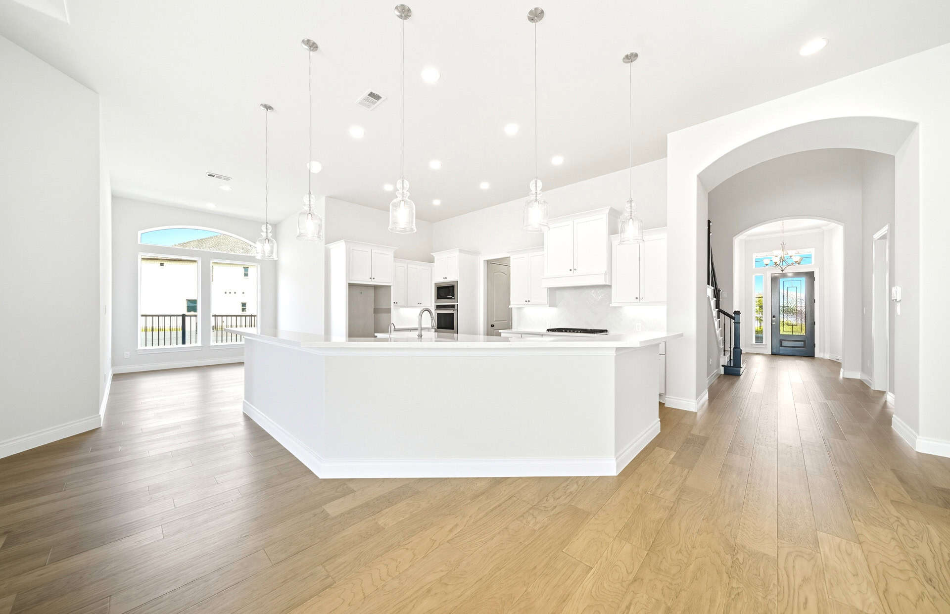 1½-story home features an elegant oval entry with 13' ceilings that open to the formal living room. The extended entry with a 21' ceiling is flanked by formal dining room on one side and kitchen on the opposite side. The kitchen is central to the home and open to the dining room, breakfast room and family room. It features a large island with high bar, 42" cabinets, stainless steel built-in microwave and oven, 36” cooktop, and dishwasher. The large 18'x21' family room features a 14' ceiling, 78" electric fireplace, and large wall of windows. The master bath includes a freestanding tub, separate shower and His and Hers vanities. Located upstairs is a game room, media room, and ½ bath. Home sits on a lot with no back neighbors and a waterfront view.