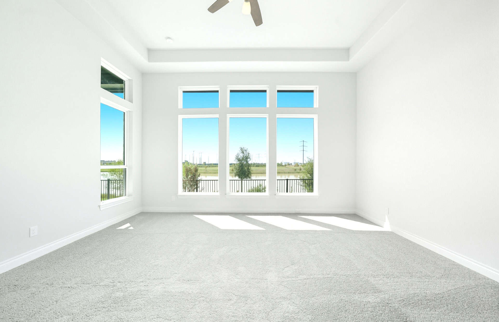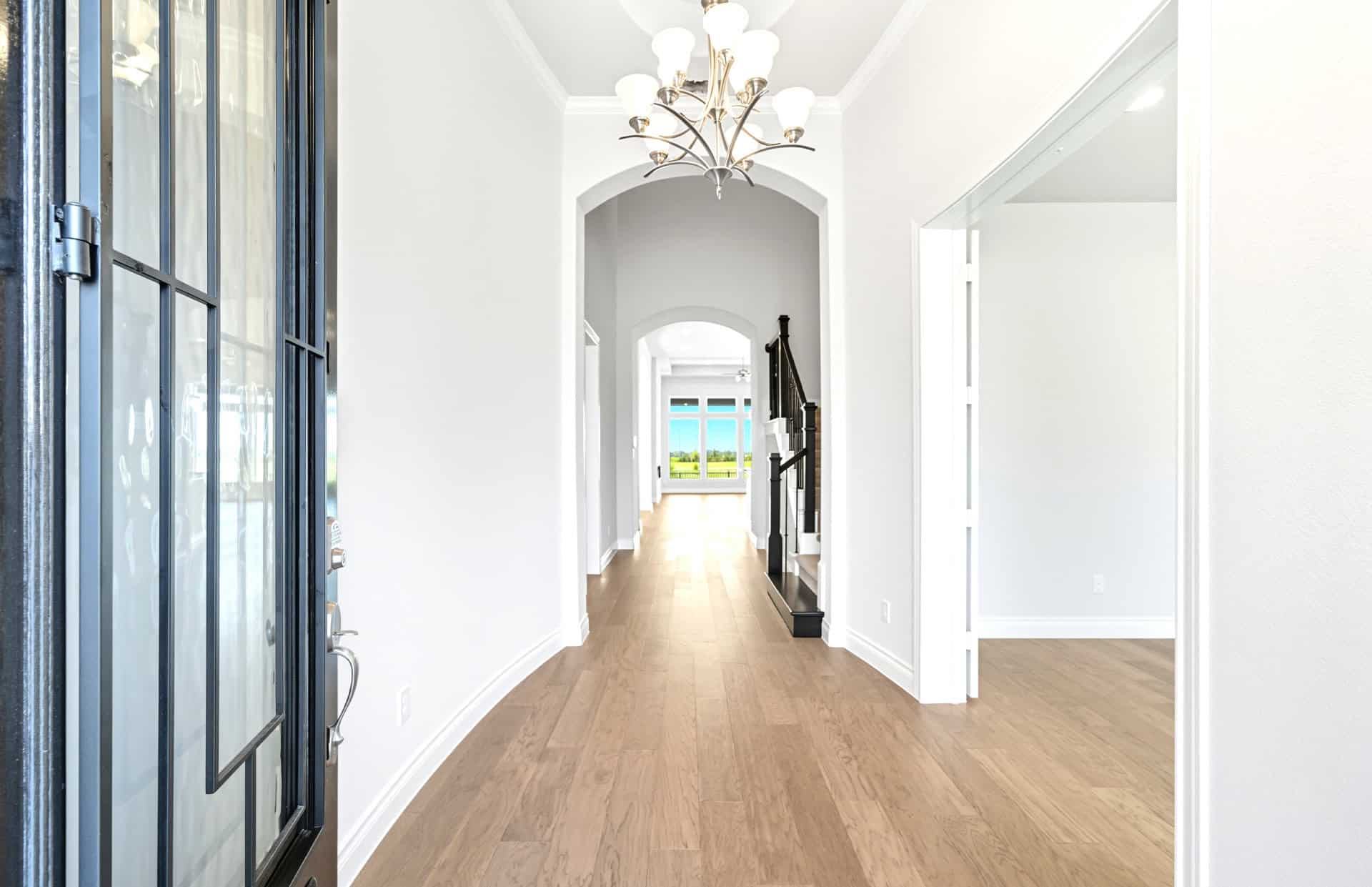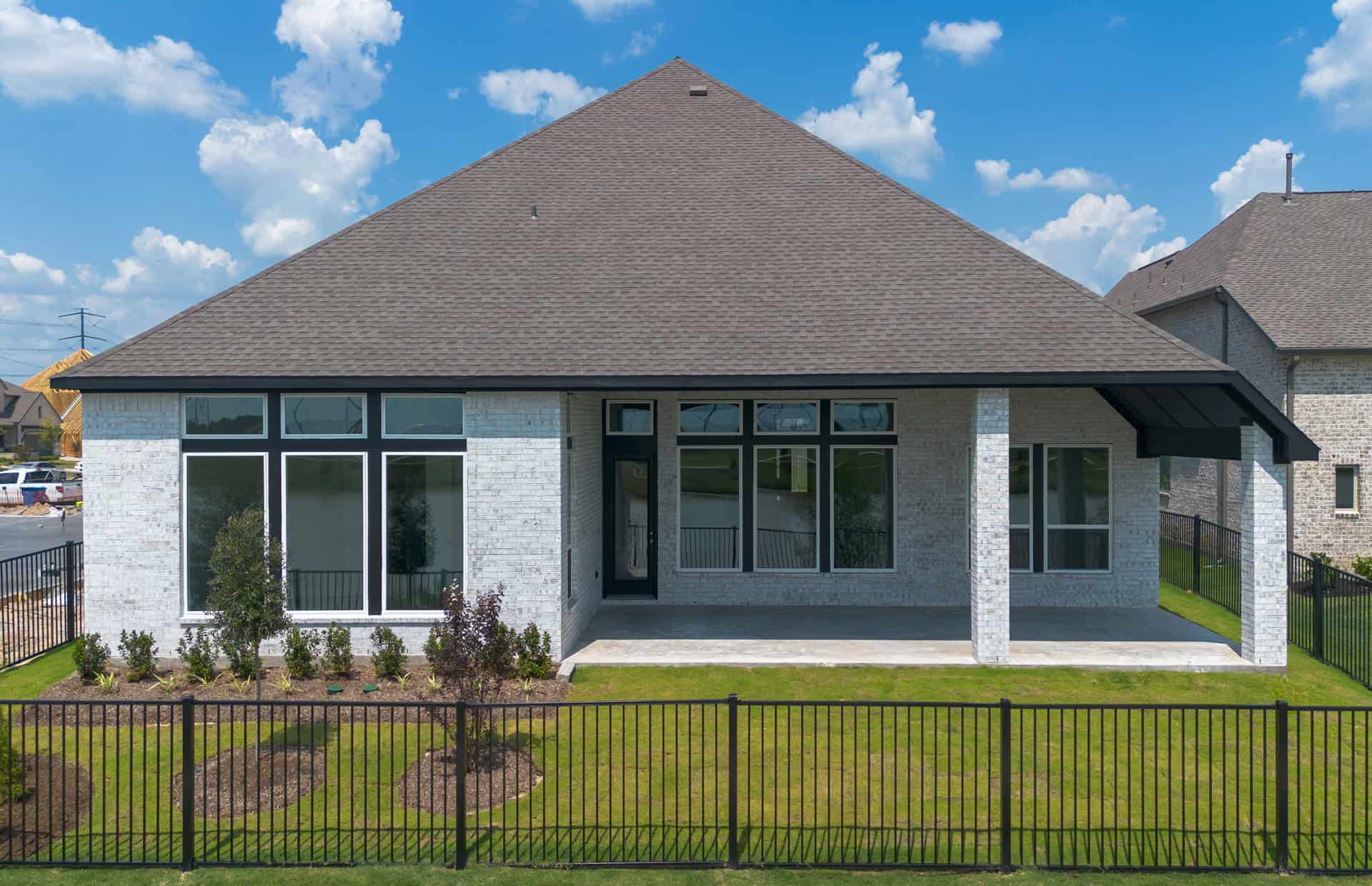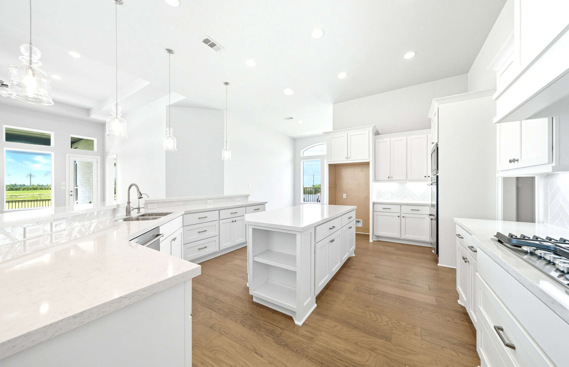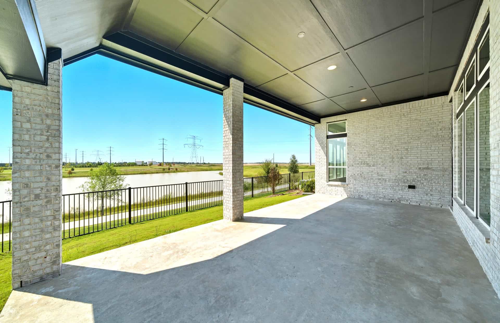 1½-story home features an elegant oval entry with 13' ceilings that open to the formal living room. The extended entry with a 21' ceiling is flanked by formal dining room on one side and kitchen on the opposite side. The kitchen is central to the home and open to the dining room, breakfast room and family room. It features a large island with high bar, 42" cabinets, stainless steel built-in microwave and oven, 36” cooktop, and dishwasher. The large 18'x21' family room features a 14' ceiling, 78" electric fireplace, and large wall of windows. The master bath includes a freestanding tub, separate shower and His and Hers vanities. Located upstairs is a game room, media room, and ½ bath. Home sits on a lot with no back neighbors and a waterfront view.