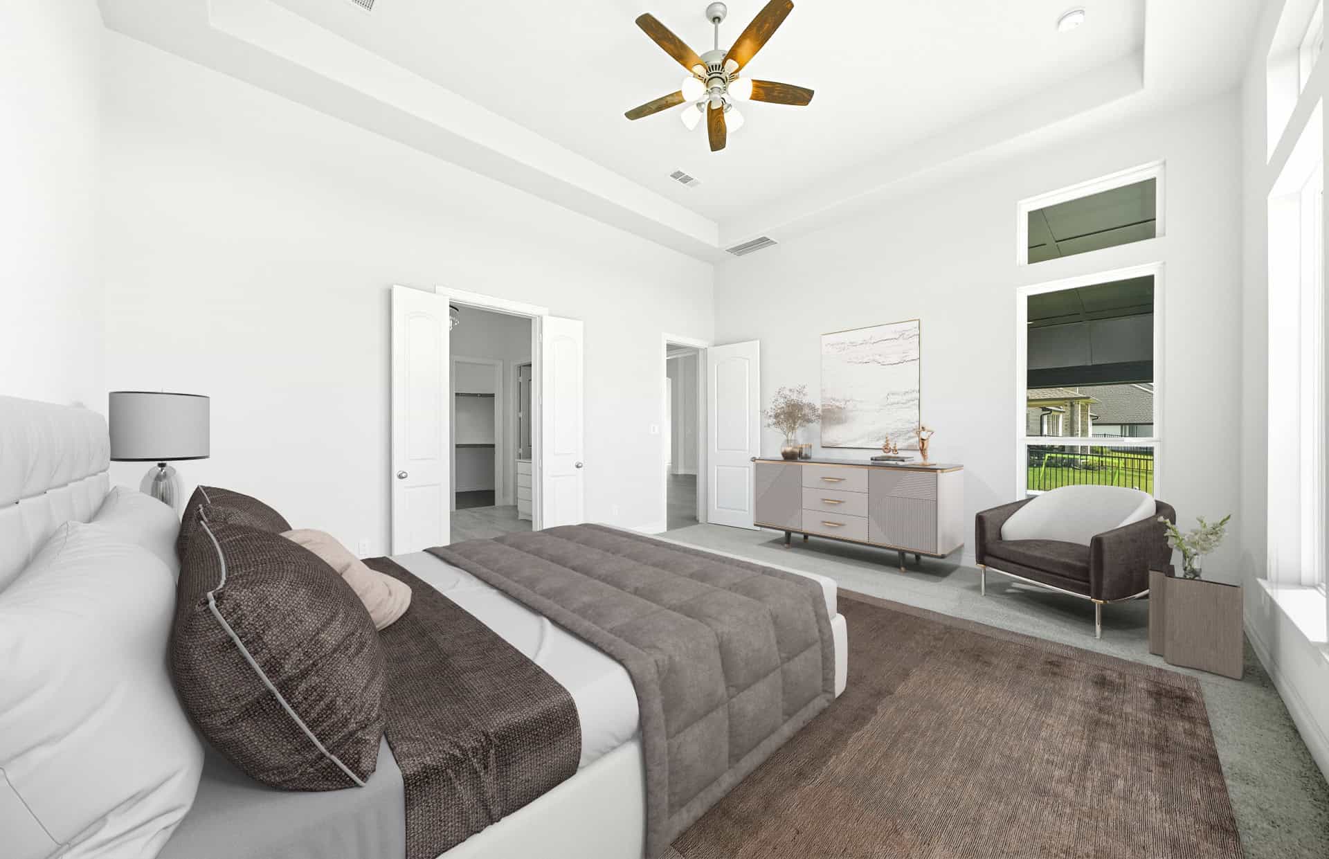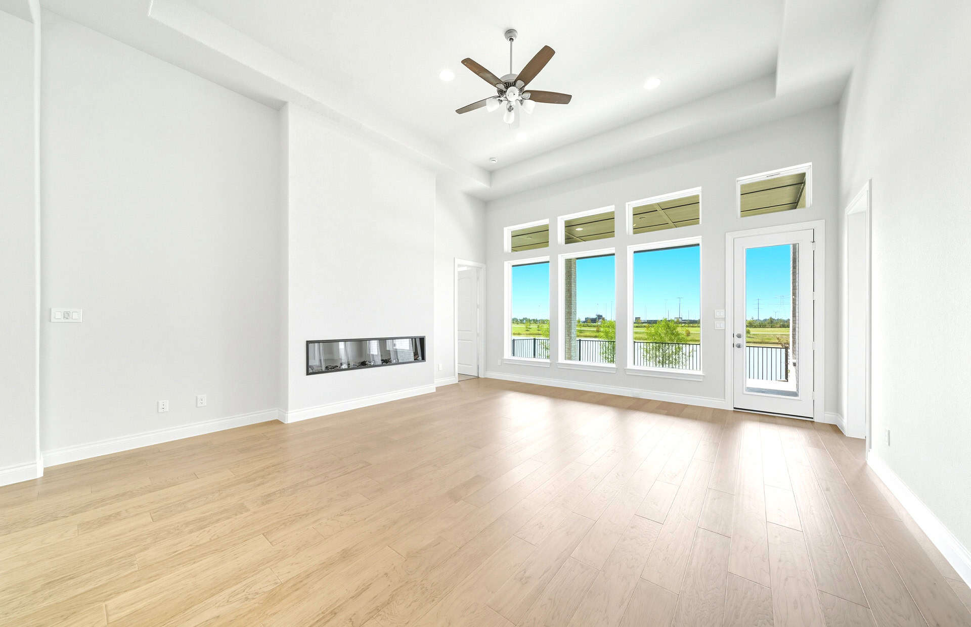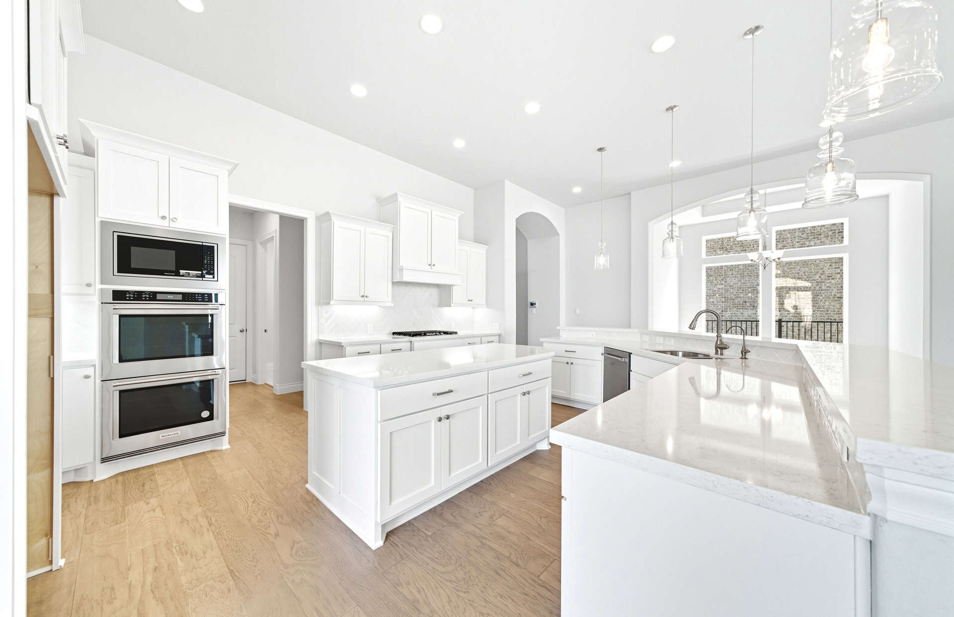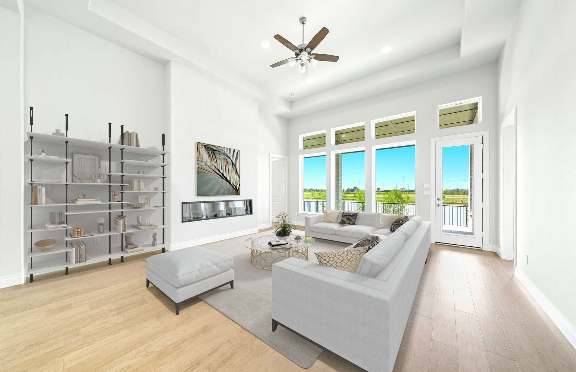 1½-story home features an elegant oval entry with 13' ceilings that open to the formal living room. The extended entry with a 21' ceiling is flanked by formal dining room on one side and kitchen on the opposite side. The kitchen is central to the home and open to the dining room, breakfast room and family room. It features a large island with high bar, 42" cabinets, stainless steel built-in microwave and oven, 36” cooktop, and dishwasher. The large 18'x21' family room features a 14' ceiling, 78" electric fireplace, and large wall of windows. The master bath includes a freestanding tub, separate shower and His and Hers vanities. Located upstairs is a game room, media room, and ½ bath. Home sits on a lot with no back neighbors and a waterfront view.