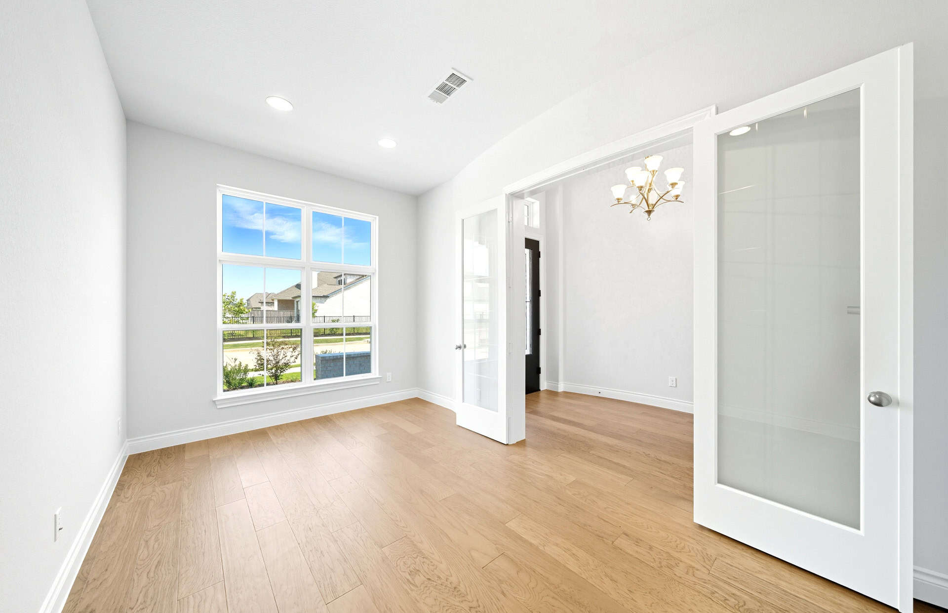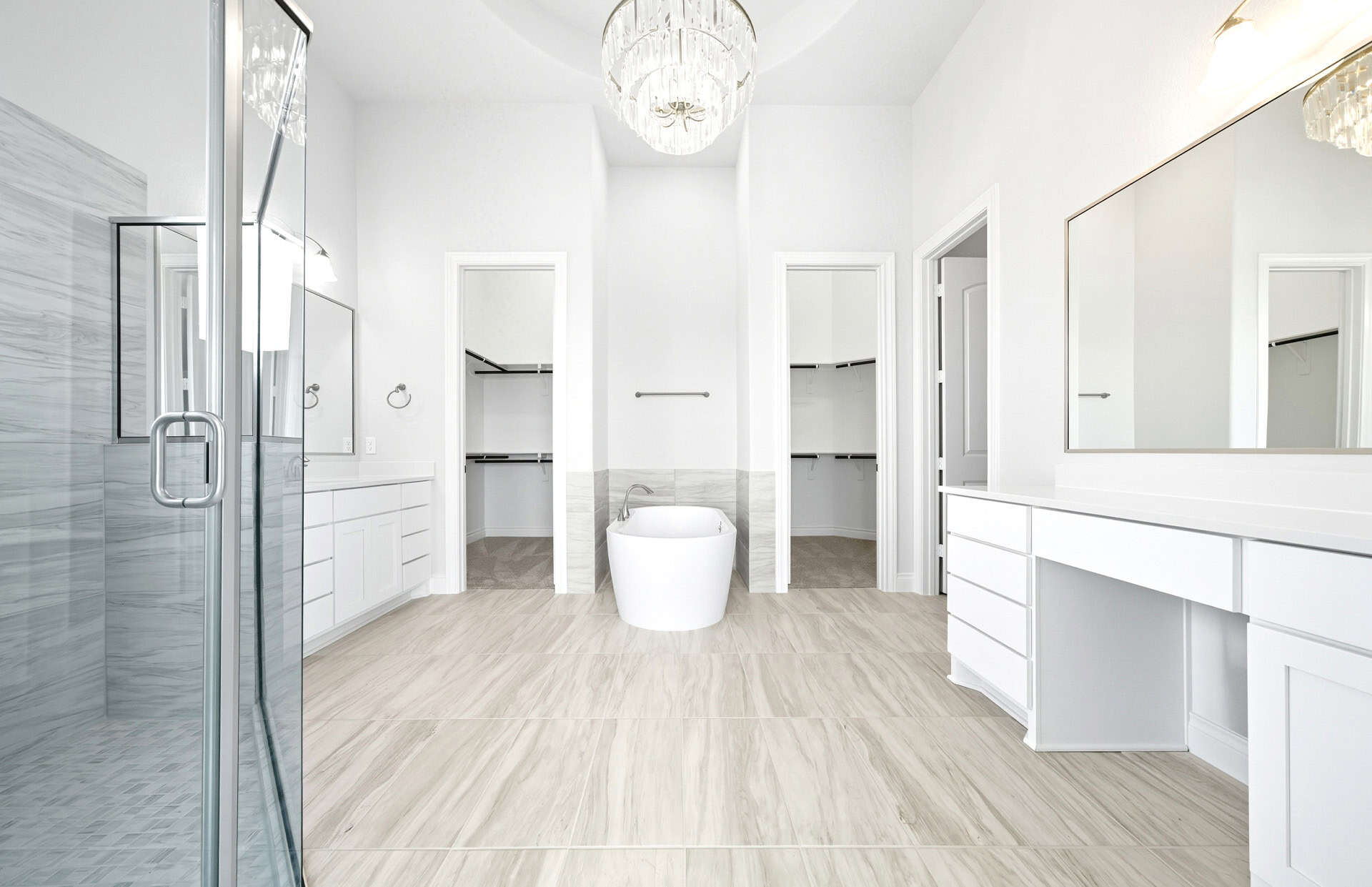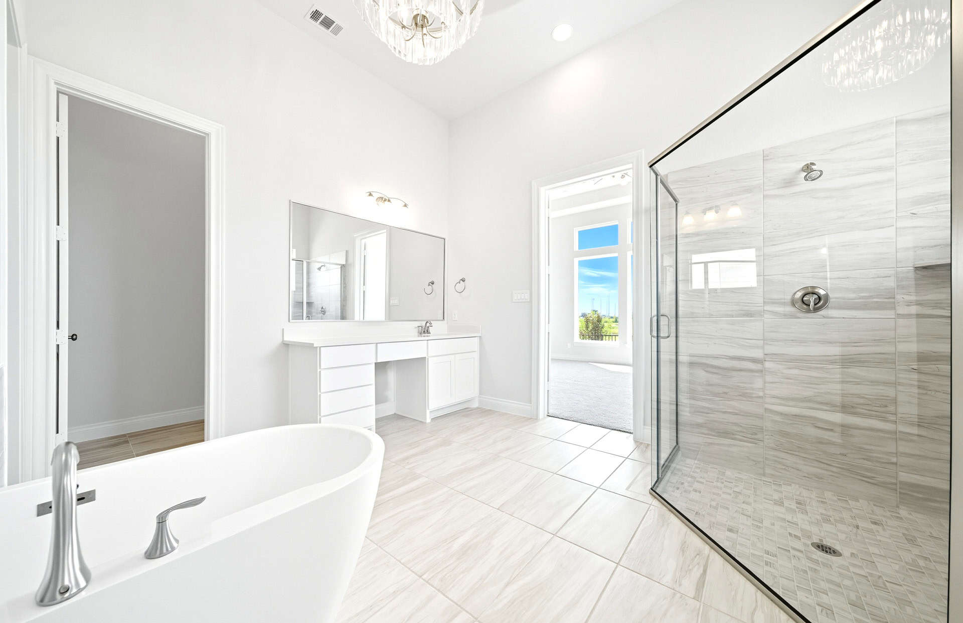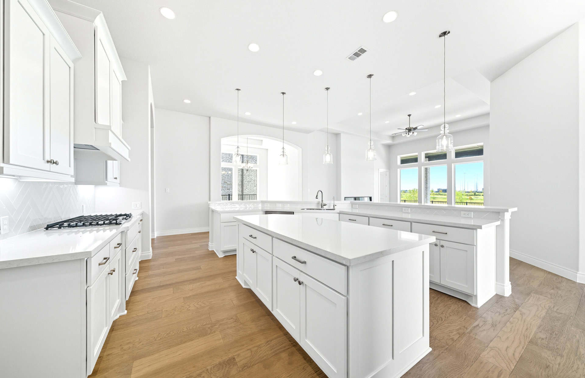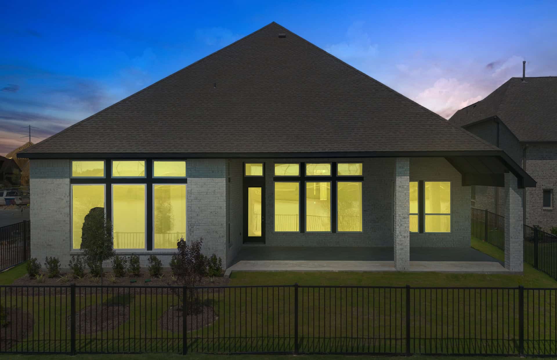 1½-story home features an elegant oval entry with 13' ceilings that open to the formal living room. The extended entry with a 21' ceiling is flanked by formal dining room on one side and kitchen on the opposite side. The kitchen is central to the home and open to the dining room, breakfast room and family room. It features a large island with high bar, 42" cabinets, stainless steel built-in microwave and oven, 36” cooktop, and dishwasher. The large 18'x21' family room features a 14' ceiling, 78" electric fireplace, and large wall of windows. The master bath includes a freestanding tub, separate shower and His and Hers vanities. Located upstairs is a game room, media room, and ½ bath. Home sits on a lot with no back neighbors and a waterfront view.