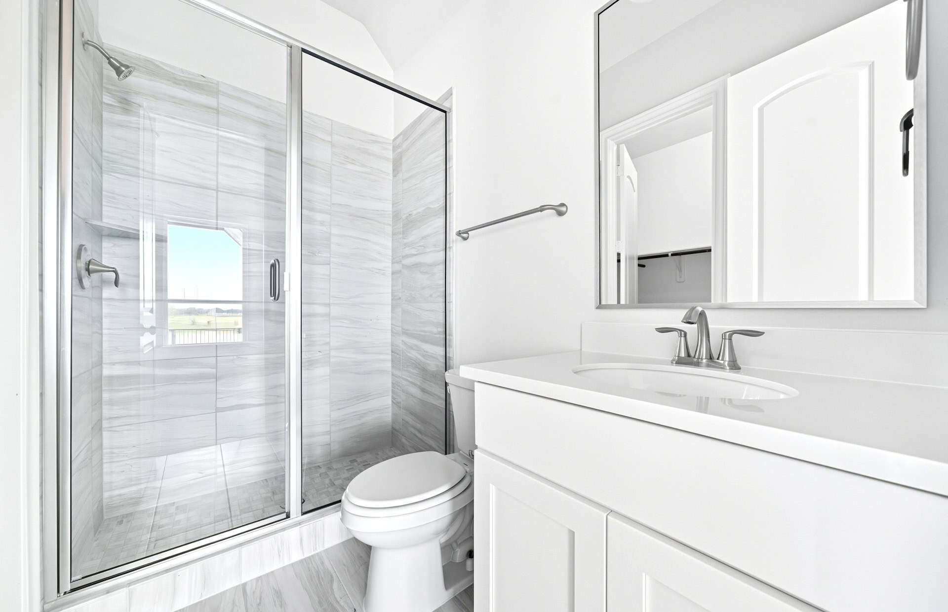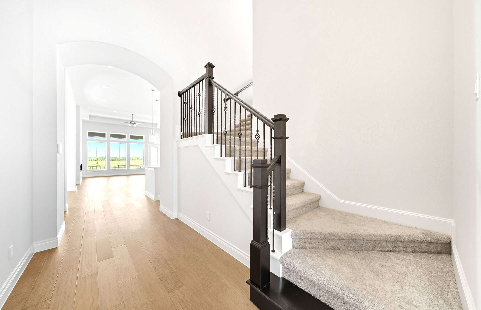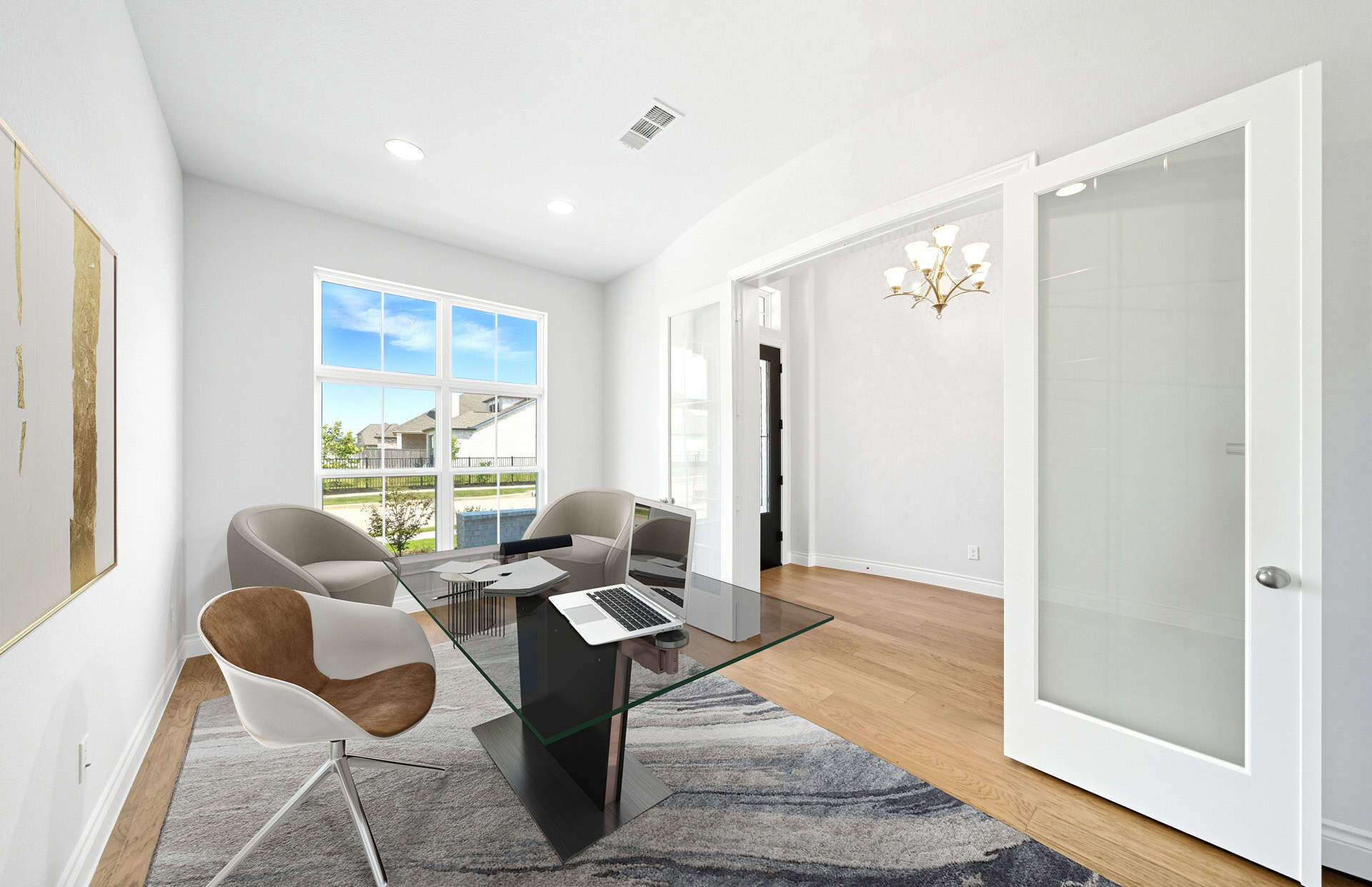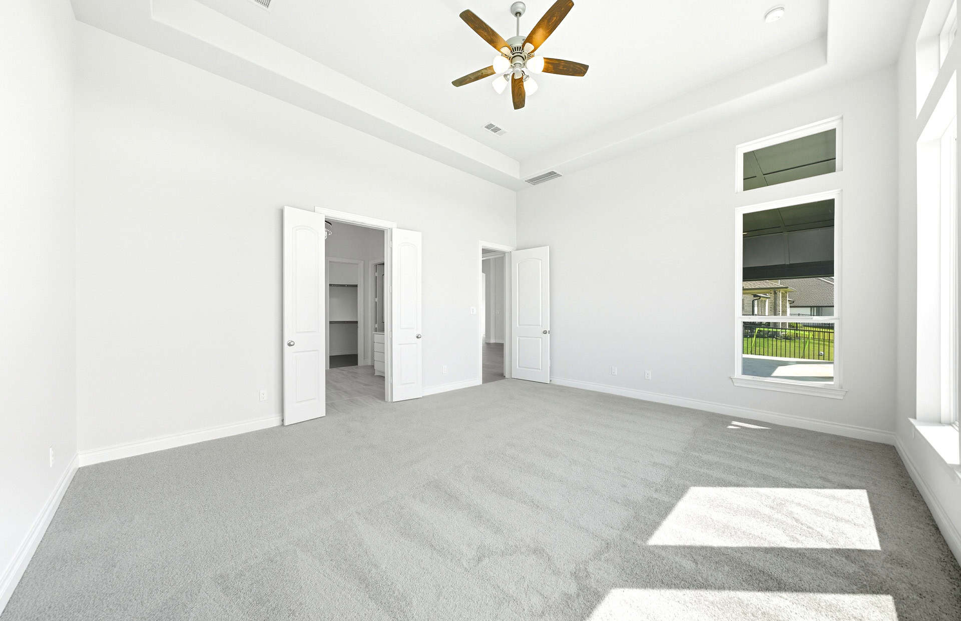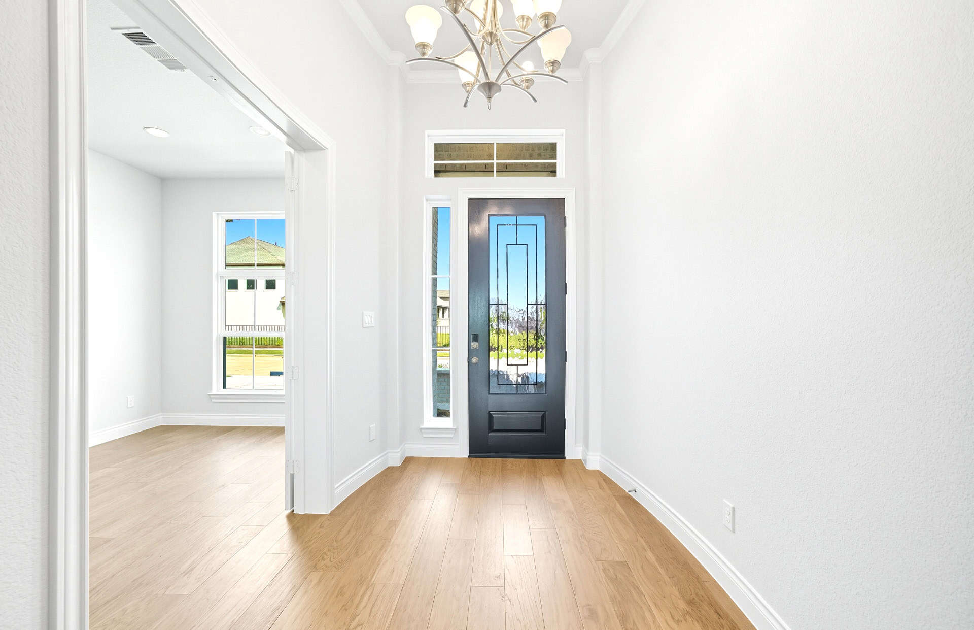 1½-story home features an elegant oval entry with 13' ceilings that open to the formal living room. The extended entry with a 21' ceiling is flanked by formal dining room on one side and kitchen on the opposite side. The kitchen is central to the home and open to the dining room, breakfast room and family room. It features a large island with high bar, 42" cabinets, stainless steel built-in microwave and oven, 36” cooktop, and dishwasher. The large 18'x21' family room features a 14' ceiling, 78" electric fireplace, and large wall of windows. The master bath includes a freestanding tub, separate shower and His and Hers vanities. Located upstairs is a game room, media room, and ½ bath. Home sits on a lot with no back neighbors and a waterfront view.