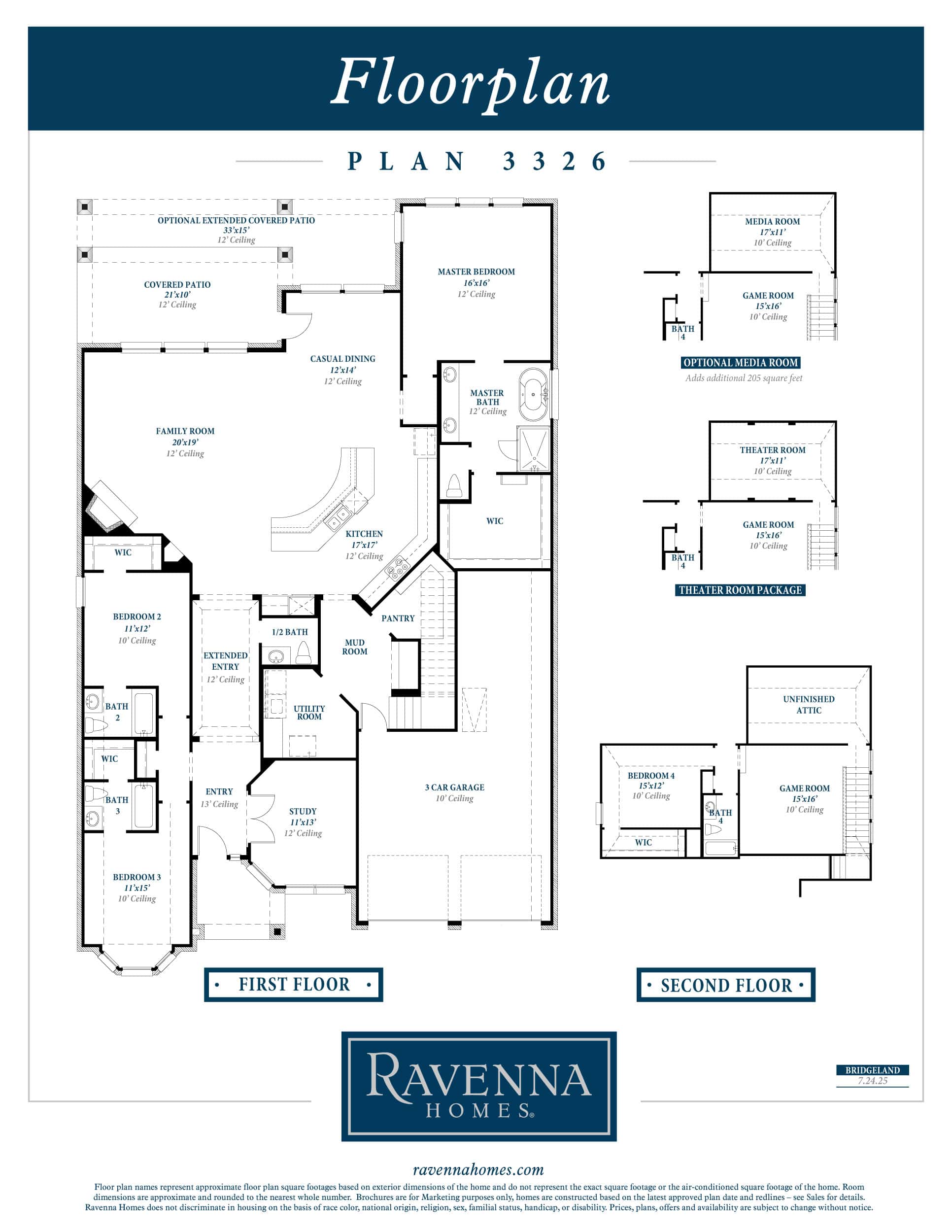 1½-story home features large entry with 12' ceilings that extend past open dining room with 12' ceilings and leads to the family room with 12' ceilings, corner fireplace and full wall of windows. Open kitchen overlooks the large family room and breakfast room, and features 42" cabinets and an oversized island with high-bar seating. Master bath includes a freestanding tub, separate shower, and His & Hers vanities. Upstairs showcases a game room, bedroom, bathroom, and theater room. Oversized 33' wide patio overlooks the backyard.