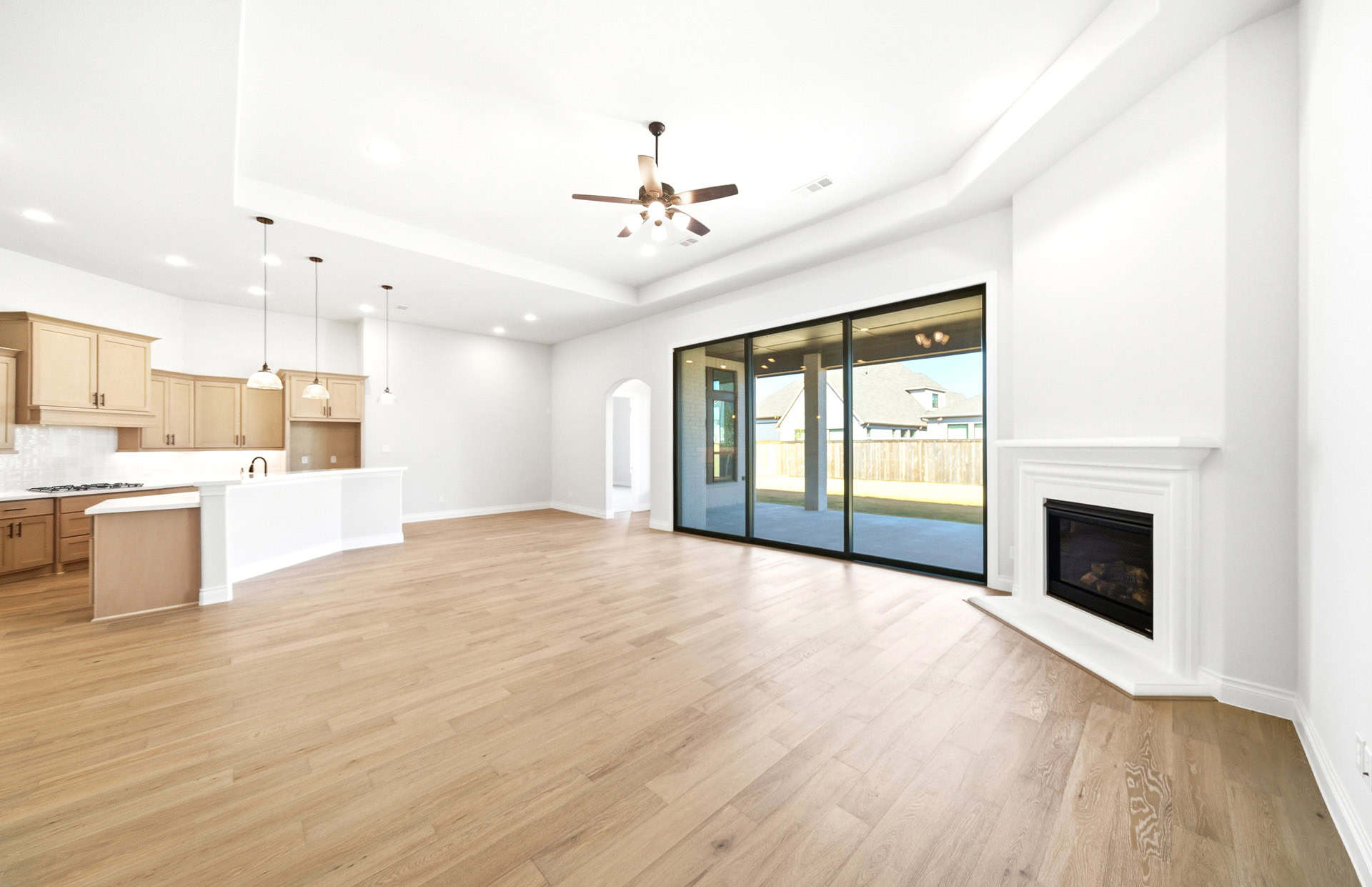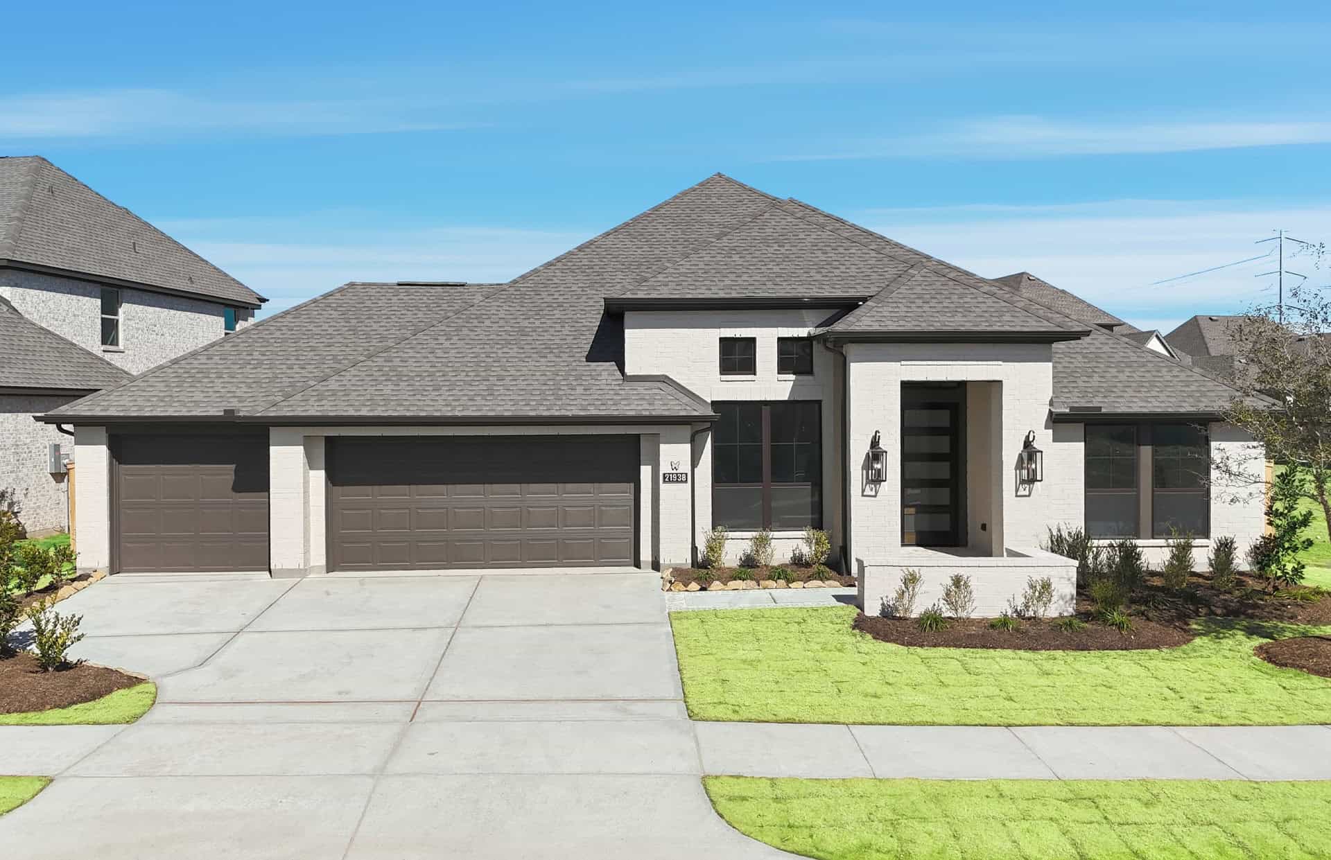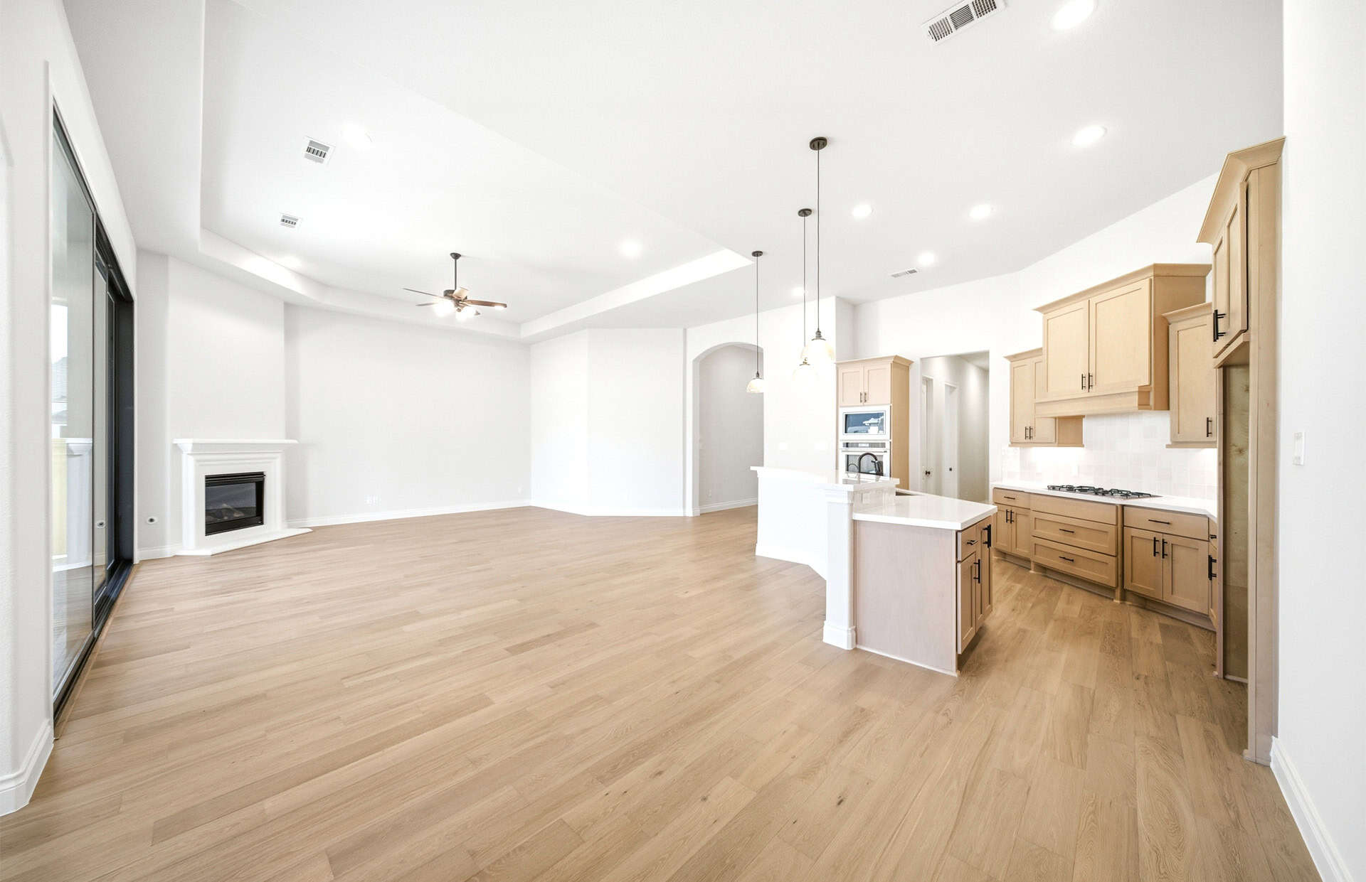 1-story floor plan features an open concept kitchen with 42" cabinets, built-in stainless steel microwave plus oven with separate gas cooktop. The large 22'x19' family room has 13' ceilings, a corner fireplace, and a full wall of windows. The master bath includes corner tub, separate shower, and a large walk in closet. Expansive 29’ wide covered patio overlooks a spacious backyard. Home is complete with a 3-car garage.