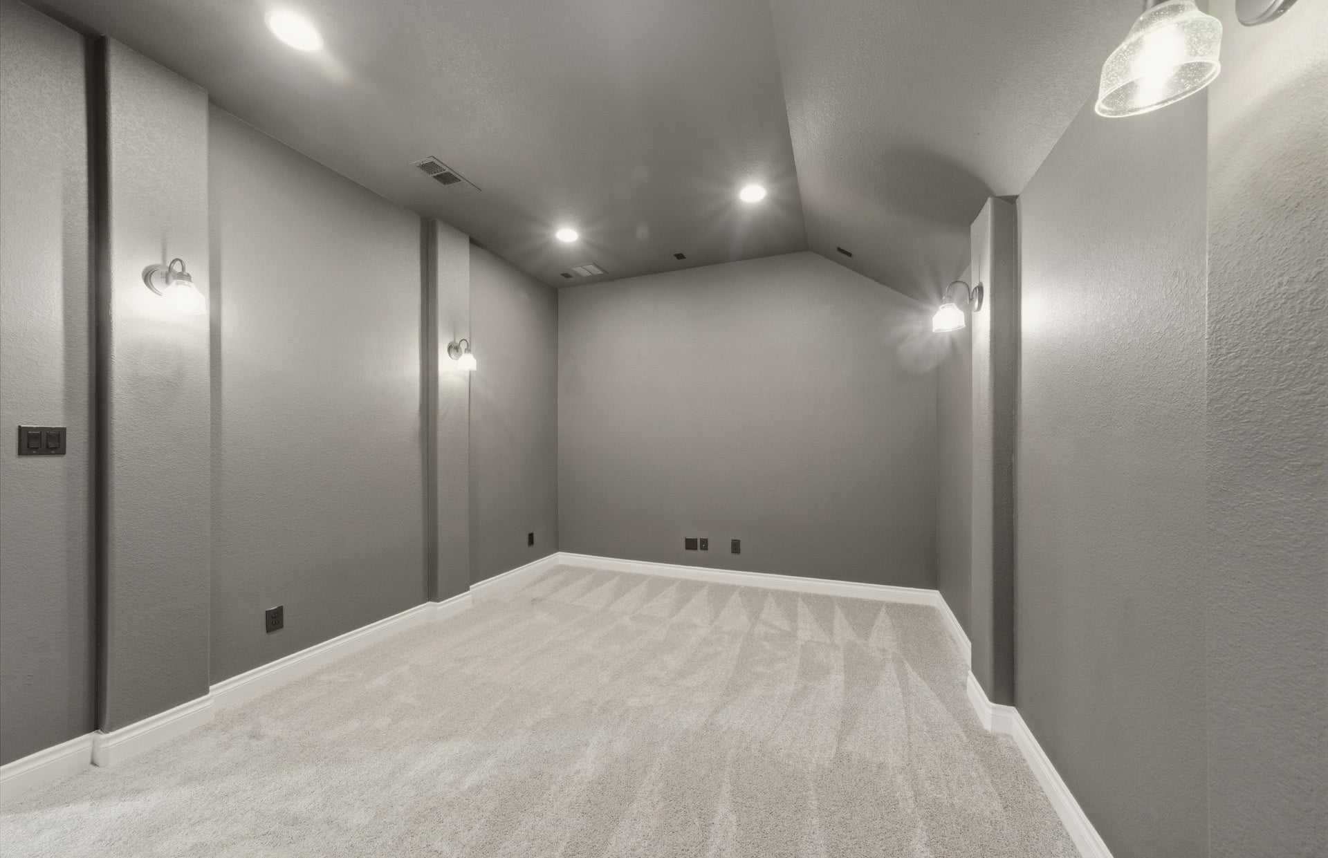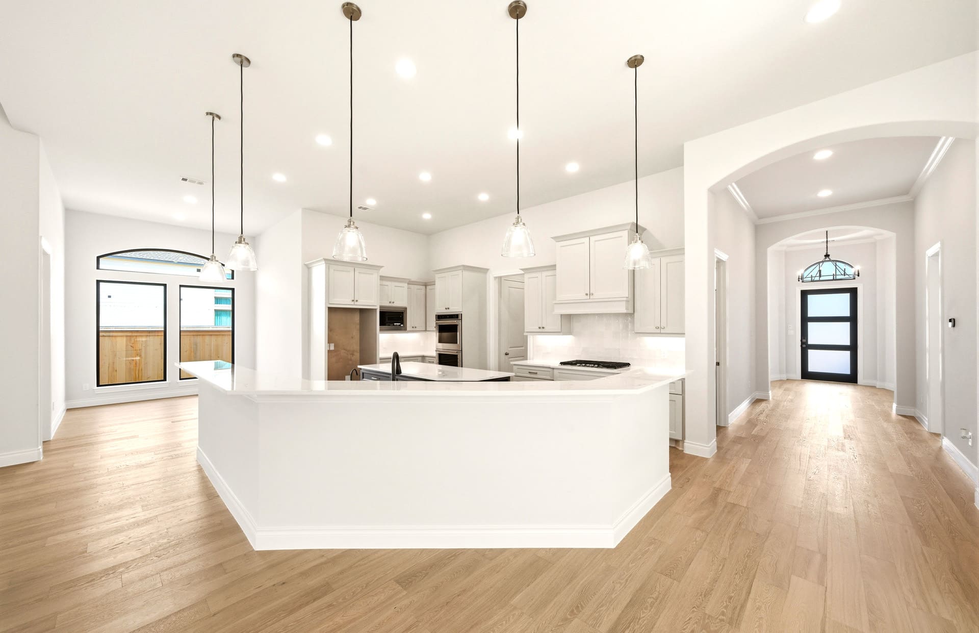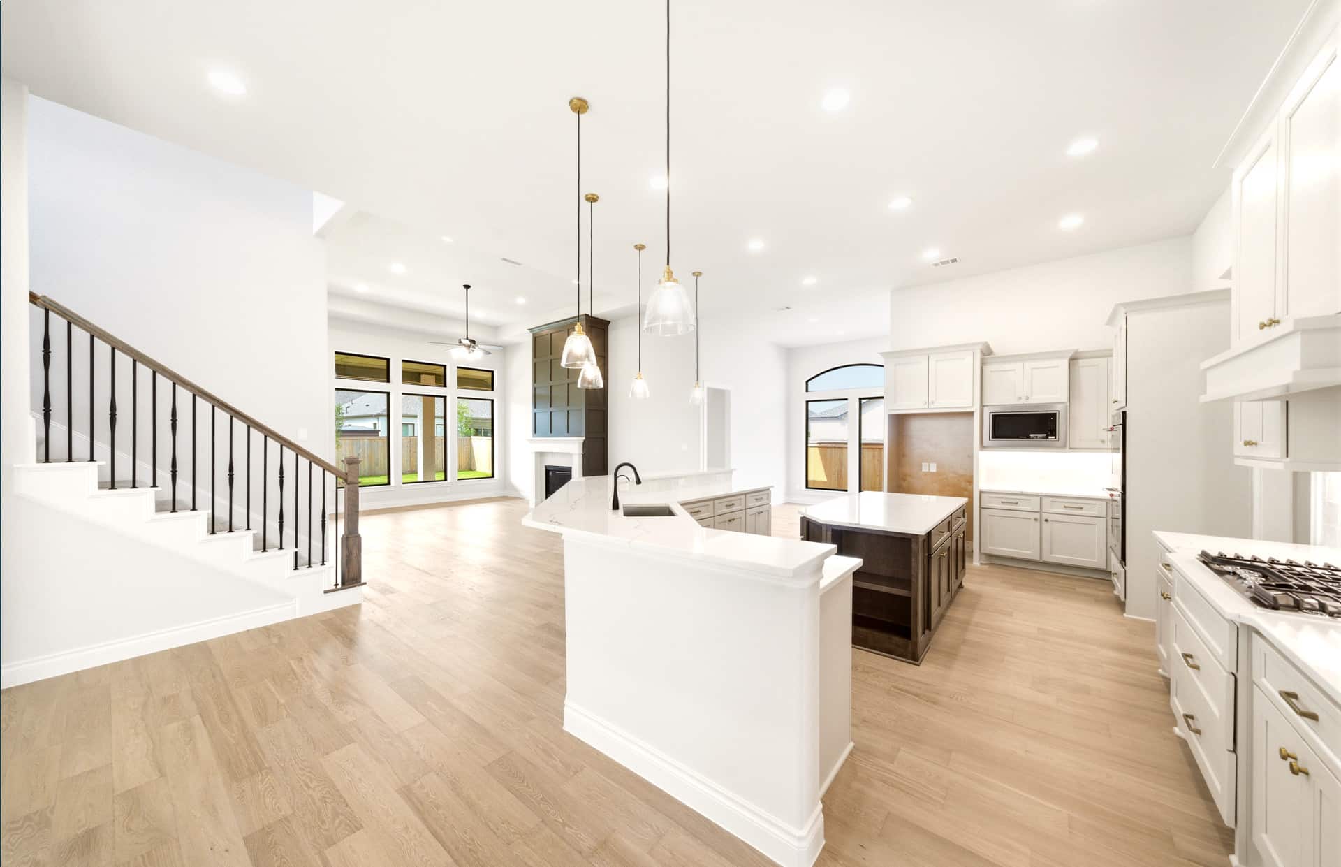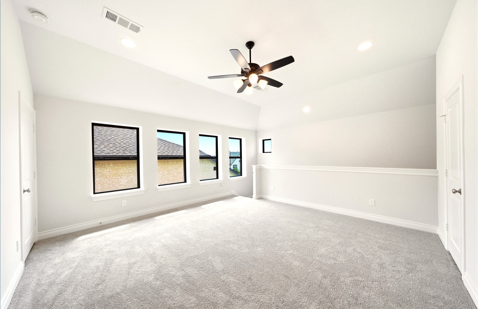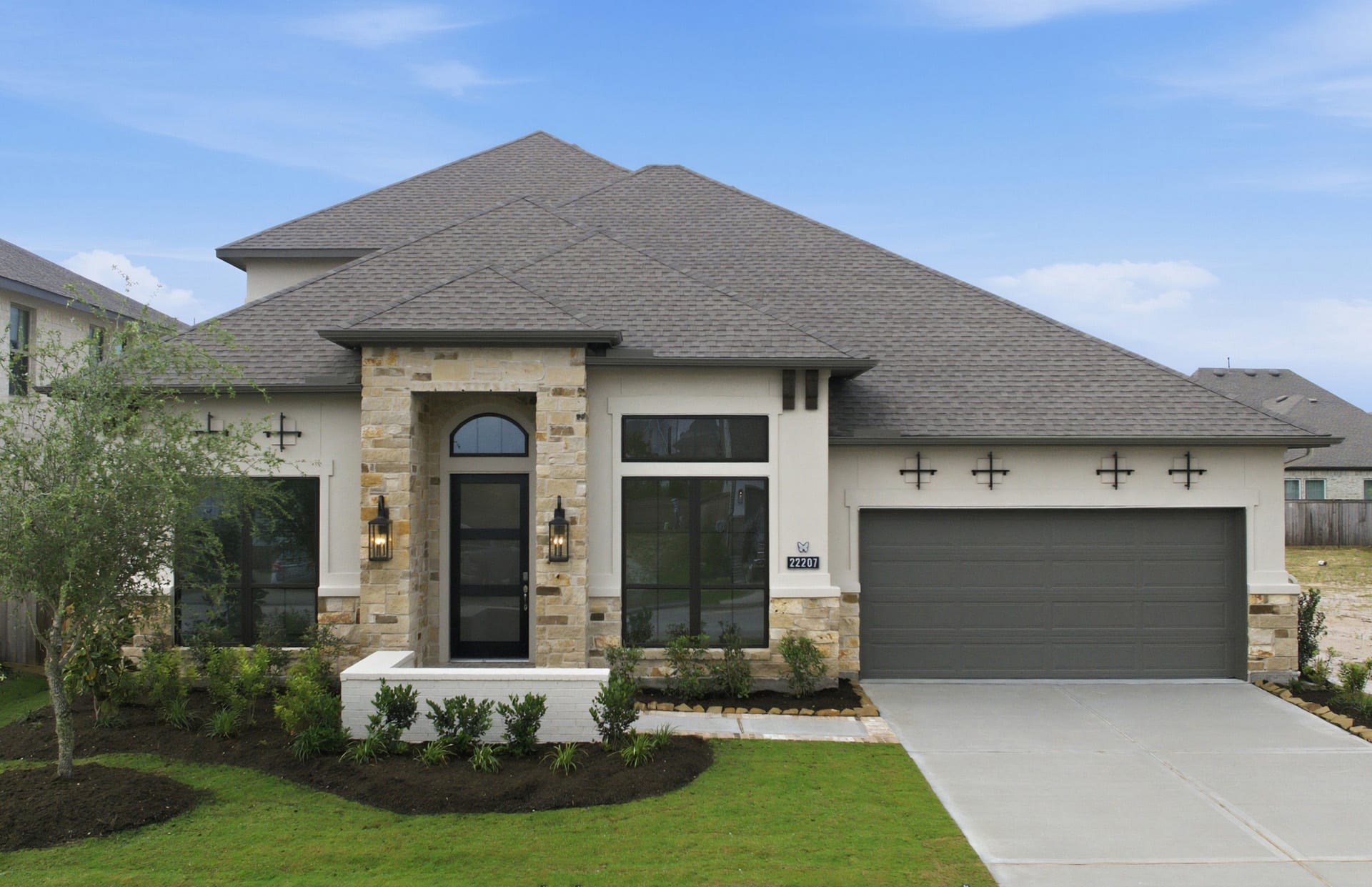 1½-story home features an elegant oval entry with 13' ceilings that open to the formal living room. The extended entry with a 12' ceiling is flanked by formal dining room on one side and kitchen on the opposite side. The kitchen is central to the home and open to the dining room, breakfast room and family room. It features a large island and 42" cabinets. The family room features a 14' ceiling, fireplace, and large wall of windows. Master bath includes a freestanding tub, separate shower, and His & Hers vanities. Located upstairs is a game room, theater room, and ½ bath. Home is complete with an oversized 29’ x 14’ covered patio overlooks the backyard.