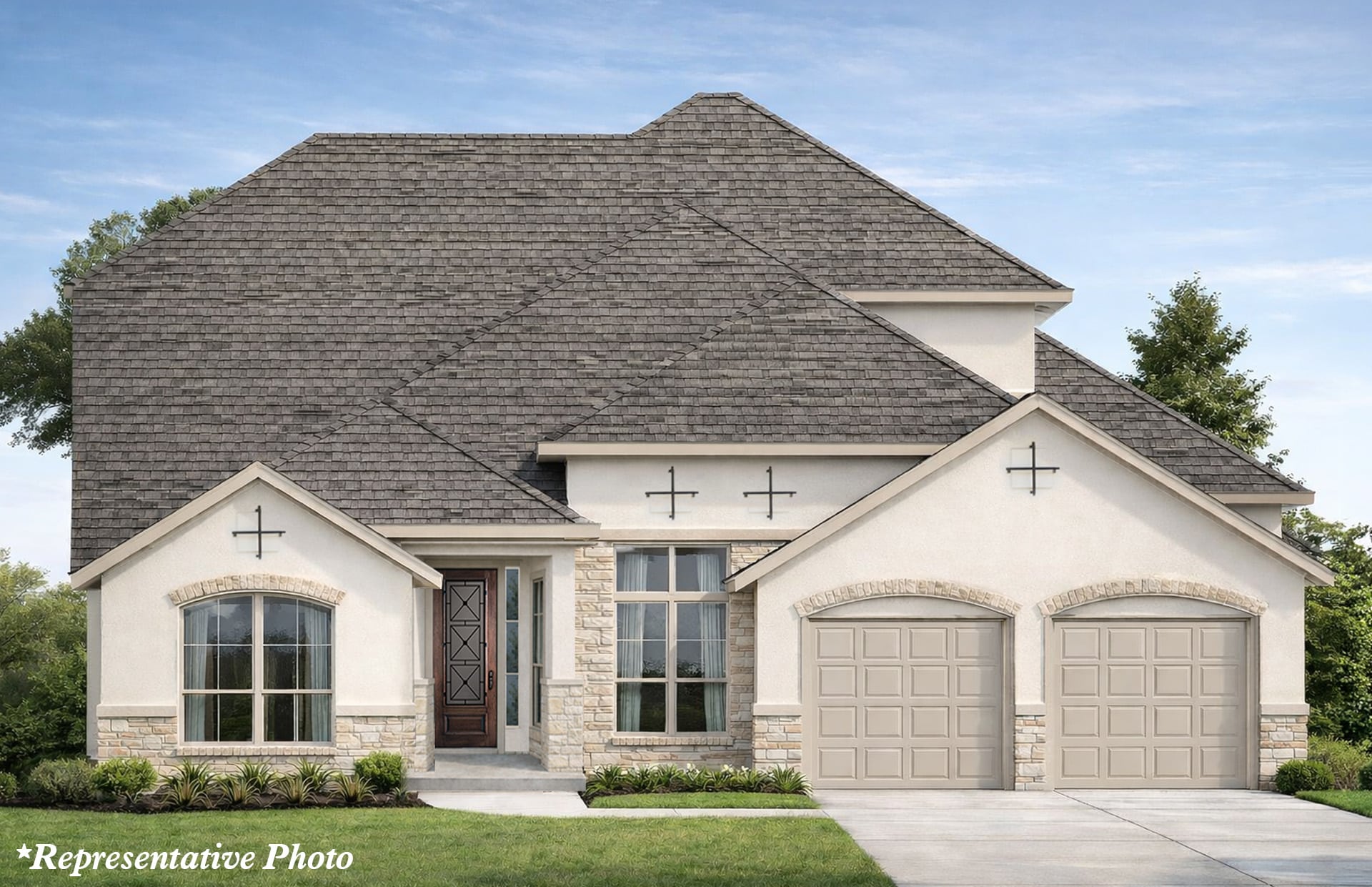 1½-story home features large entry with 12' ceilings that extend past open dining room with 12' ceilings and leads to the family room with 12' ceilings, corner fireplace and full wall of windows. Open kitchen overlooks the large family room and breakfast room, and features 42" raised panel cabinets and an oversized island with high-bar seating. Master bath includes a freestanding tub, separate shower and His and Hers vanities. Upstairs has a game room, theater room, bedroom, and bathroom. Home is complete with an oversized 33' wide patio that overlooks a wooded backyard.