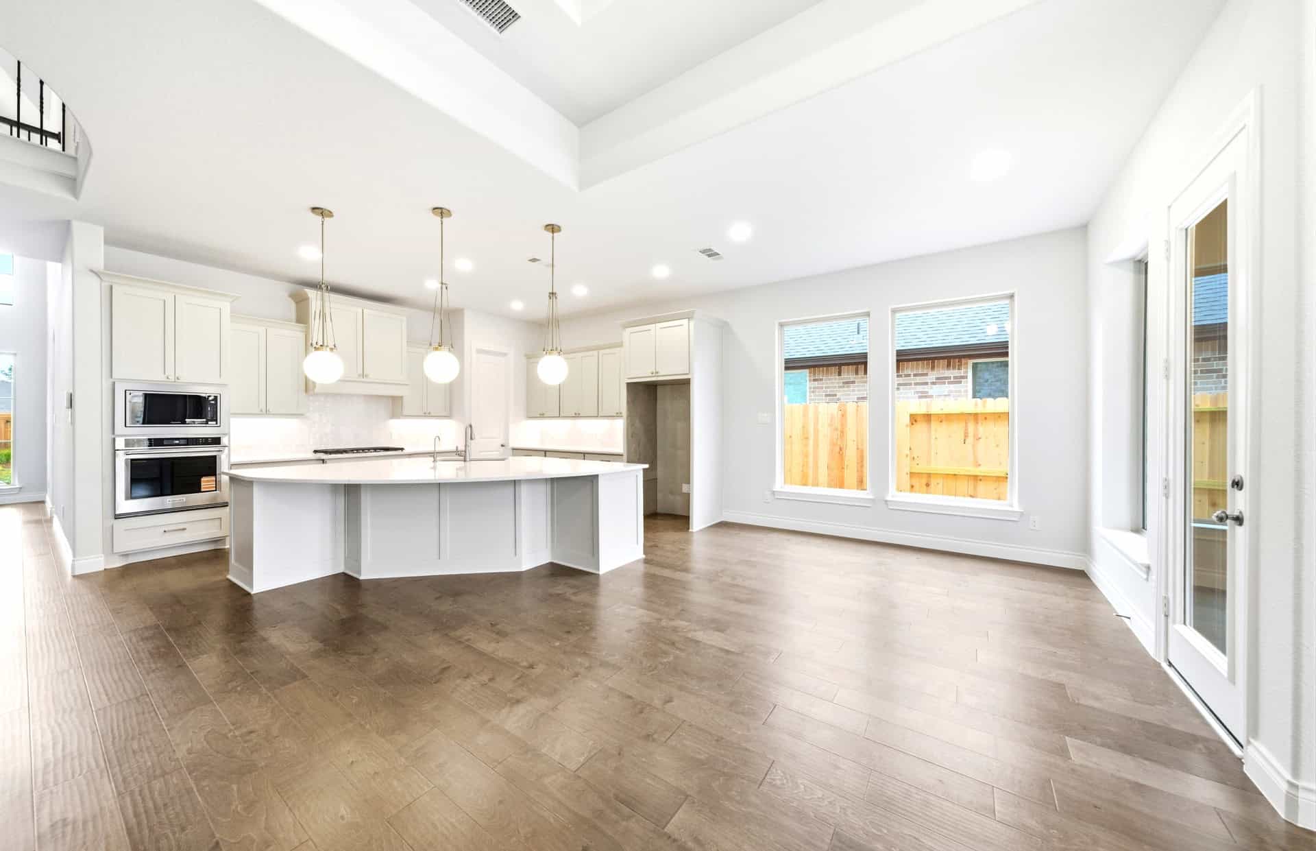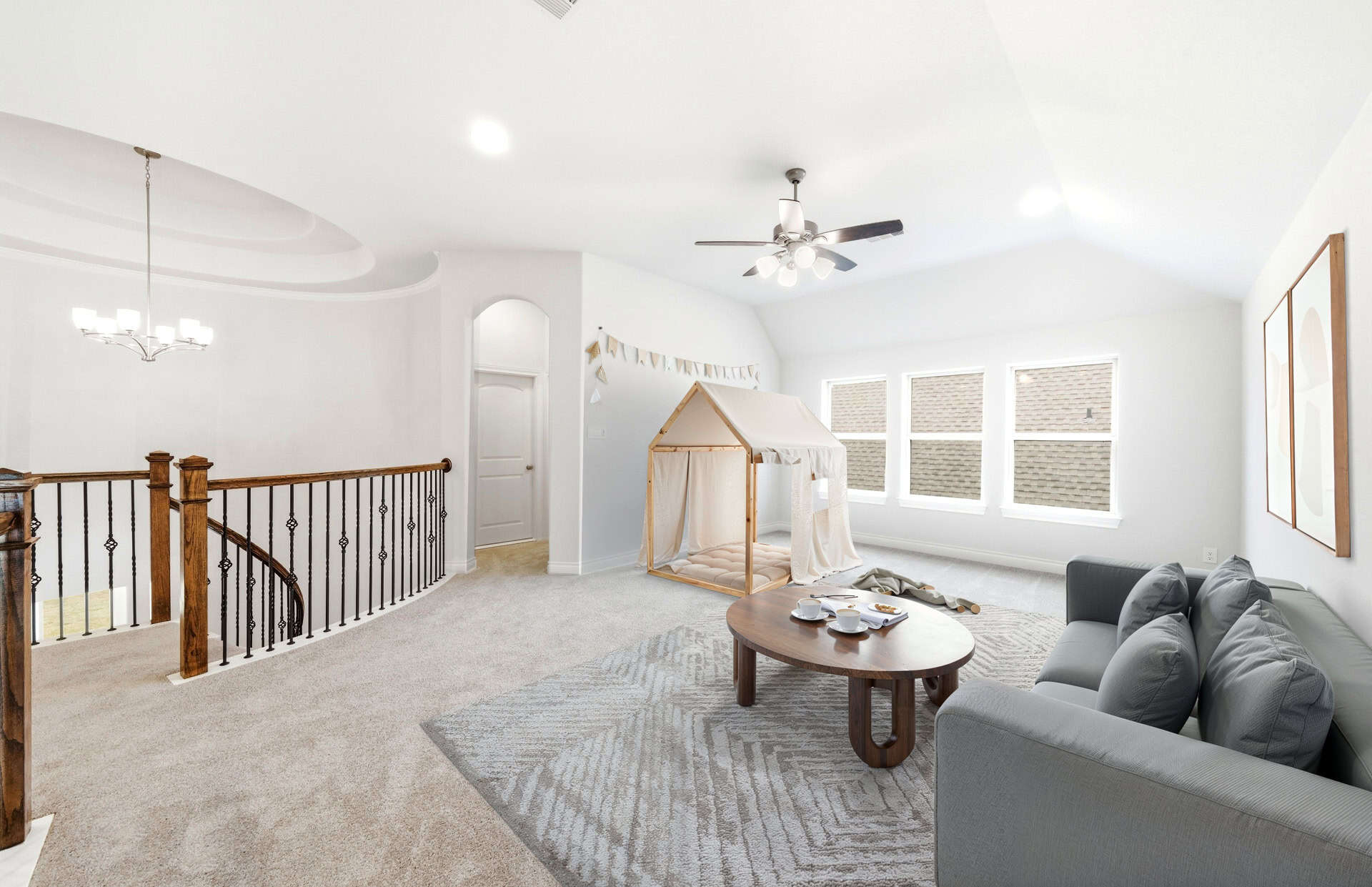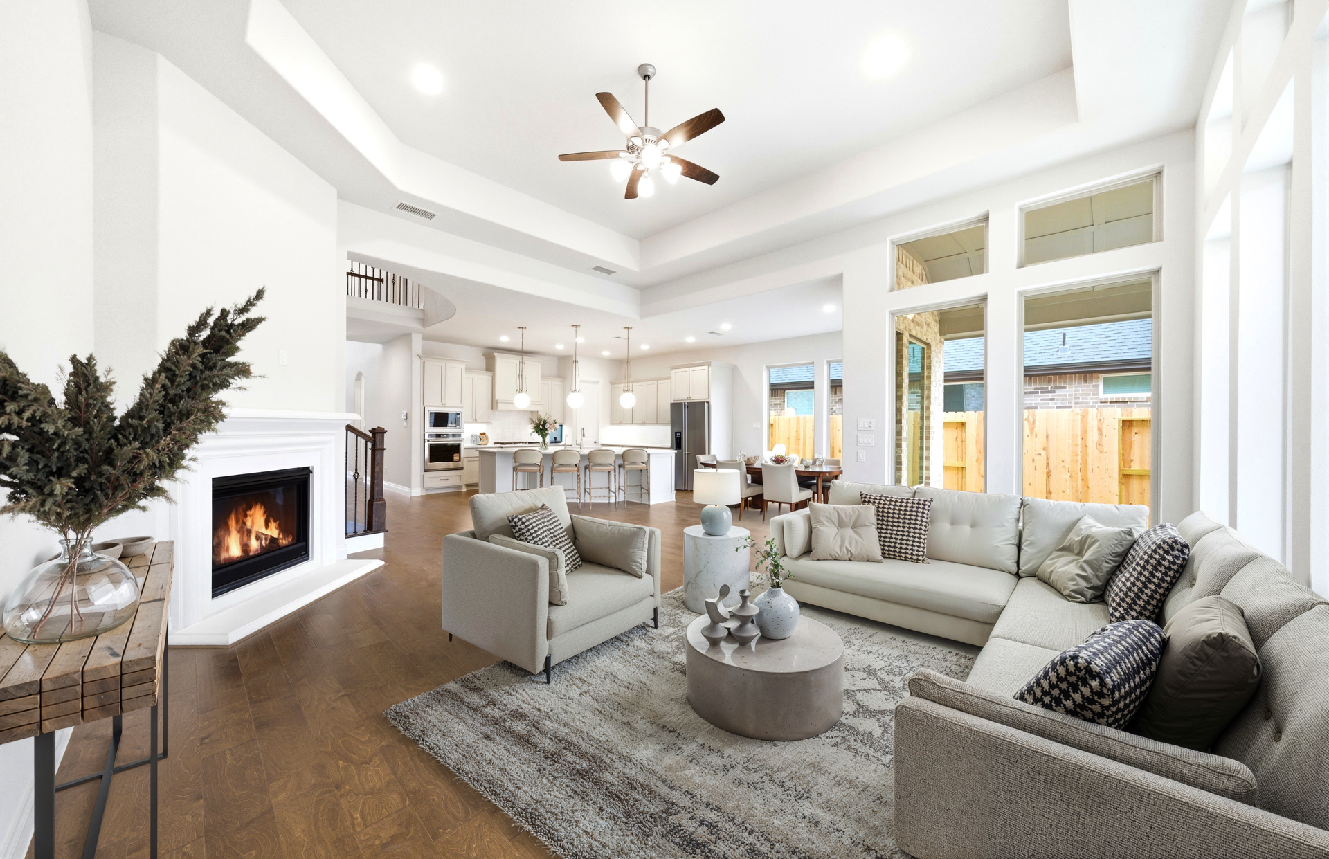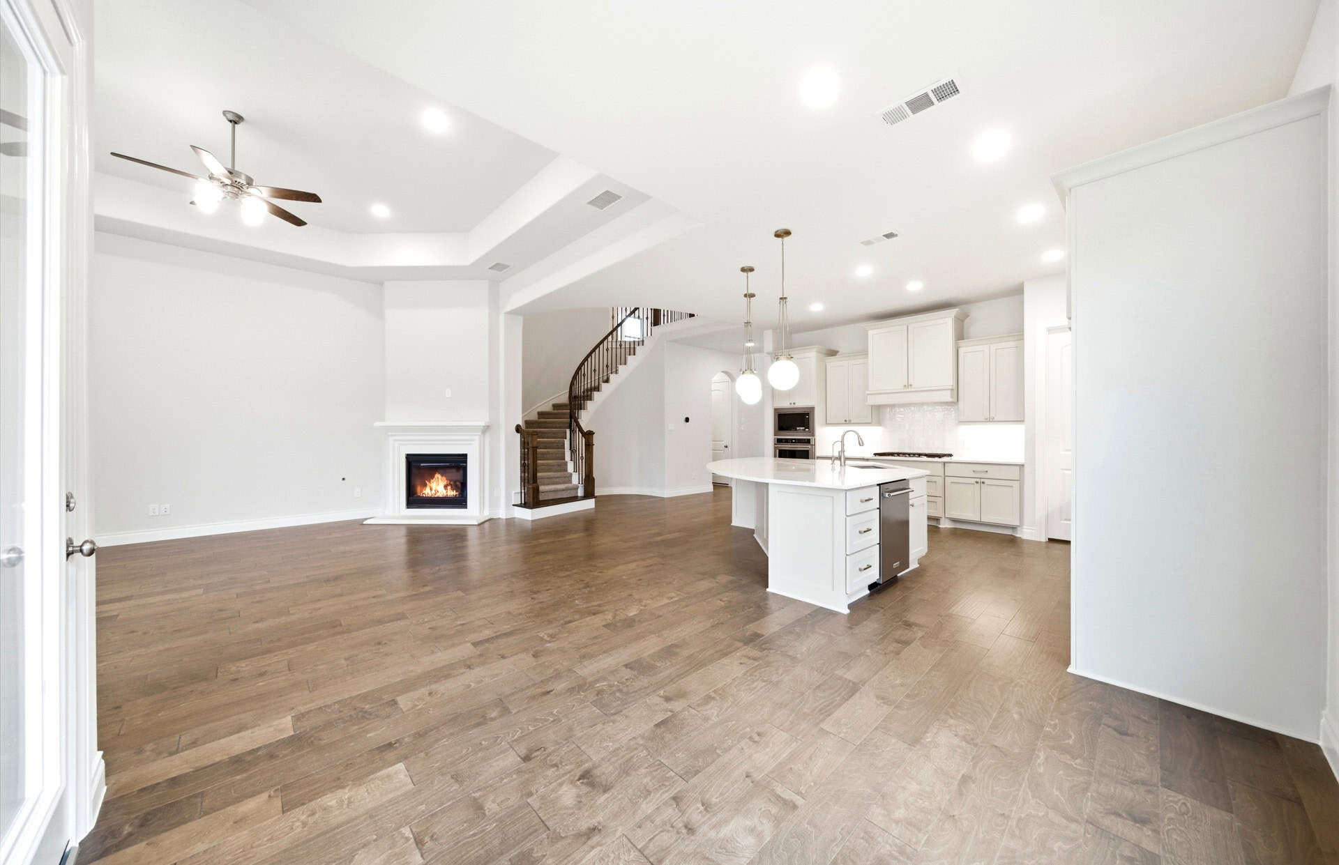 2-story floor plan features large entry with 21' ceilings that leads you to the statement staircase. The open concept layout connects the kitchen, large family room, and casual dining area. The kitchen features 42" cabinets, an oversized island, KitchenAid appliances including a 36” stainless steel cooktop. The centrally located family room displays 13' ceilings, a corner fireplace, and full wall of windows. The master bath includes a freestanding tub, separate shower, His and Hers vanities, and separate closets. Upstairs features a large 20'x14' game room, 2 bedrooms, and a full bath. Home is complete with an oversized 24' wide patio
